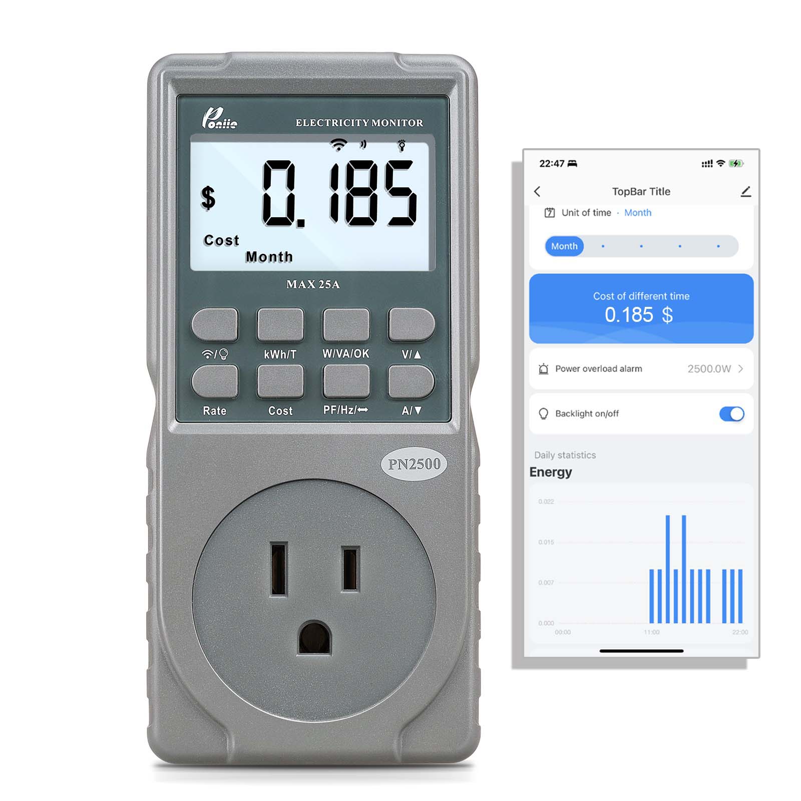 <b>Poniie PN2500 Wi-Fi Wireless High-Power Charging Monitor Power Usage Meter</b><br><br><i><b>Your Key to Save on Electricity Bills</b></i><br>Are you tired of skyrocketing electricity bills that seem to drain your wallet month after month? It's time to take control and make informed choices with our advanced Power Monitor. Say goodbye to the guessing game and hello to significant savings.<br><br>Simply connect to a NEMA 5-15 standard outlet and then plug a device in to this unit. Now you gain real-time visibility into your energy consumption, enabling you to identify energy-hungry appliances, optimize usage, and reduce wastage. It's like having your personal energy detective right at your fingertips.<br><br>New PN2500 goes beyond basic monitoring by offering a comprehensive information, you can identify "vampire" appliances, understand usage patterns, and pinpoint areas where you can save. But that's not all--Our new monitor takes convenience to the next level with Wi-Fi app control. Simply download the iOS or Android app, and you'll have full insights from your smartphone. Monitor usage, set Billed KWH, reset record data etc. The monitor itself can provides full functionality without Wi-Fi.<br>